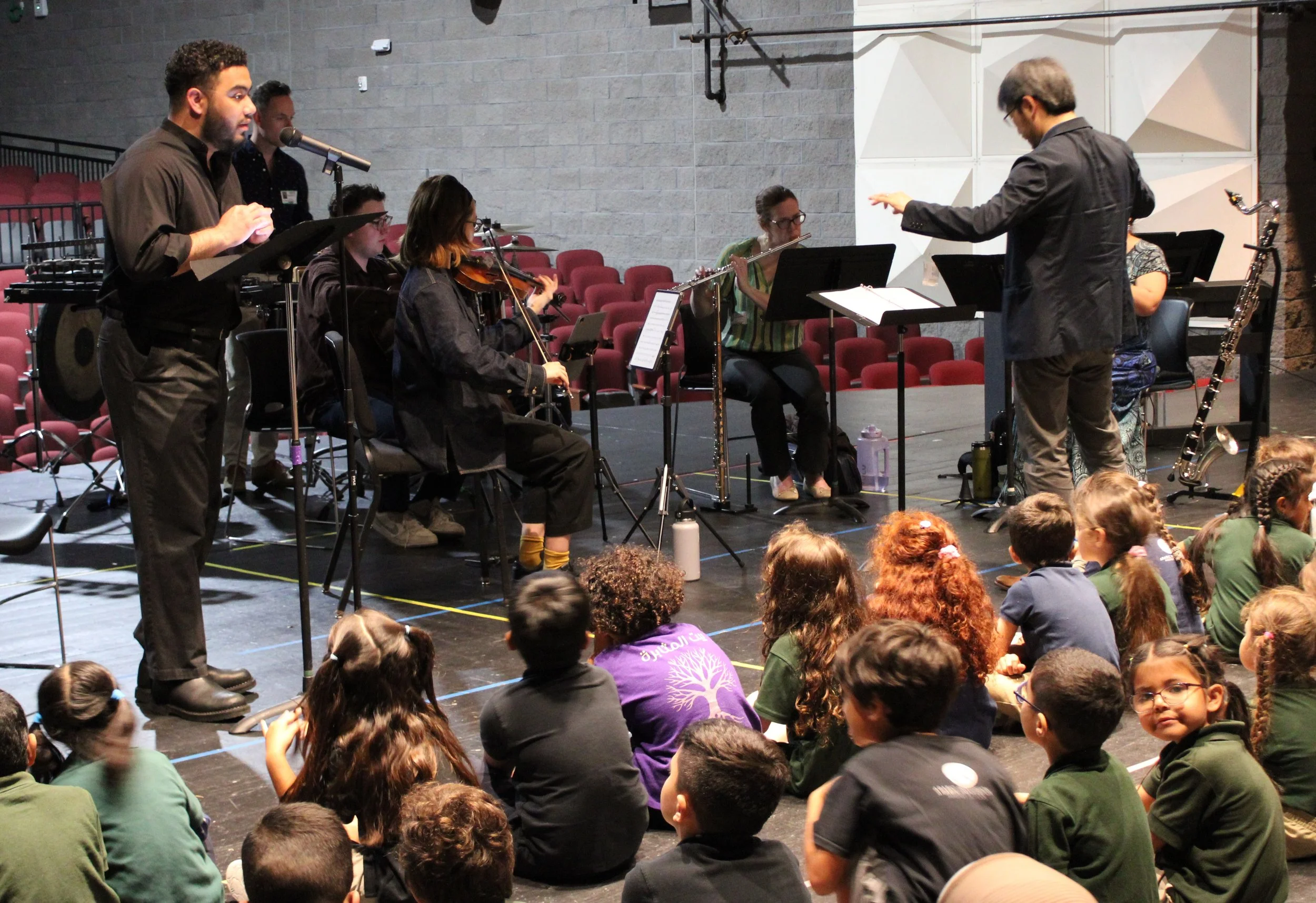 Next was performance day. Each school hosted live performances featuring six instrumentalists, narrator, and conductor. The music transformed school spaces into concert halls and transported young audiences into the worlds of Parizade, Kuafu, and the Moon Rabbit.